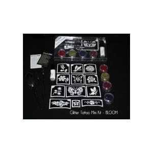 GLITTER TAT BLOOM KIT Contents: 4 Glitters - 10 gram jar, 12 pcs 3 layer Stencils (Flowers ; Butterflies) 1 Glimmer Glue (10ml) 1 Set of Glitter Tattoo Brush - Specially designed to pick up ; paint-on glitters. 1 Glimmer Care Card / Glimmer Instruction Card. The Glitters ; Glimmer Glue in this kit can make 60-80 Glitter Tattoos using the Paint On Technique.
