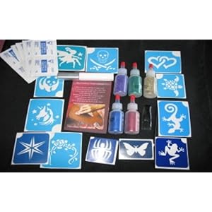 Medium Party Rainbow Kit - includes 12 stencils, brush, detail applicator, alcohol swabs, 5 glitters (Emerald Green, Purple, Gold, Canadian Blue, Apple Red) 10ml body glue, directions.